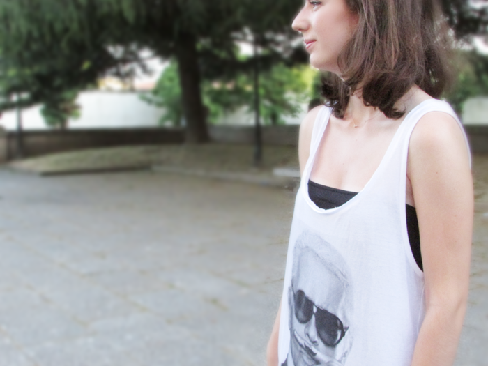 We keep enjoying a really good summer, temperatures are still high and we can not wear our beloved jeans; we have to choose cooler outfits. This time we picked this ElevenParis tee (the first time I saw this I thought: "Hey, what a cool guy is Karl Lagerfeld! but then I realised that it was all a montage...) and we chose a comfy pair of leggings to wear with the tee, so the outfit was suitable for summer. Finally, these sneakers from Sandro, with the perfect wedge, neither too high nor too low, and my beloved Prada bag that, although it has a wintery color, I can wear the entire year, it’s so handy!